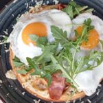 With cheese, bacon, fried eggs and arugula